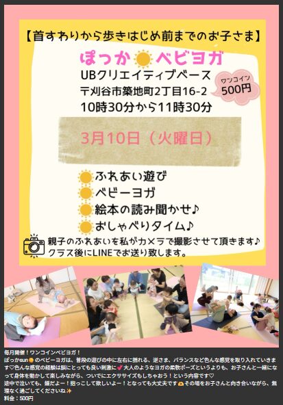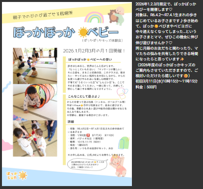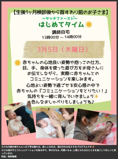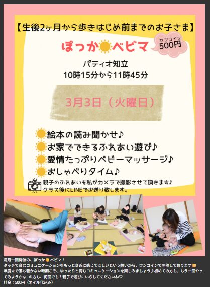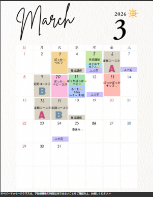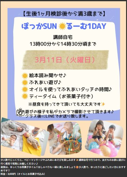3月のケジュールをアップしました 2026 2/06 お知らせ 2026.2.6 ご予約は、公式ラインよりお待ちしてます。 お知らせ ベビーマッサージ 2月のケジュールをアップしました 関連記事 2月のケジュールをアップしました 2026.2.6 12月のスケジュールをアップしました 2025.10.16 11月のスケジュールをアップしました 2025.10.13 ホームページが新しくなりました。 2025.7.30 1月より、養成講座2期をスタートします。 2025.7.30 ぽっかぽっかキッズの募集を開始します 2025.1.1